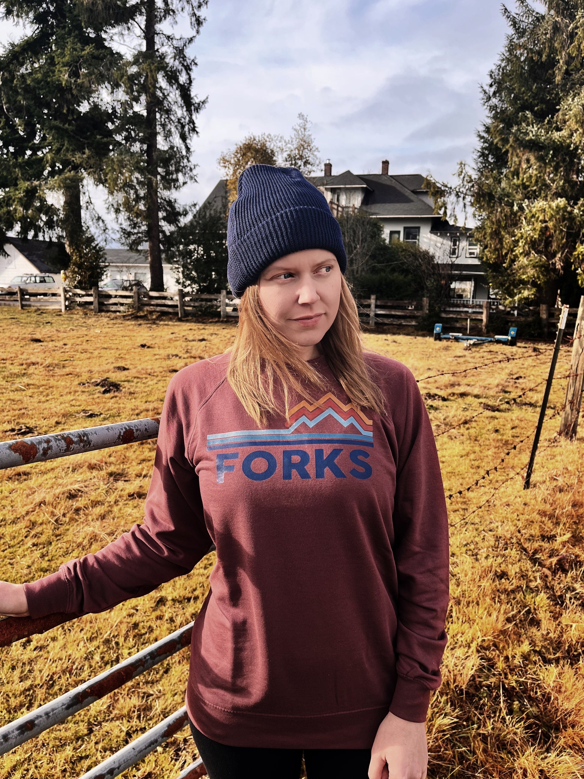 Wishing you were in the wettest place in the continental US? Declare your love of Forks with our new lightweight sweatshirts. Perfect for those cool, rainy days. Pair with our knit beanie in navy for true cozy vibes.